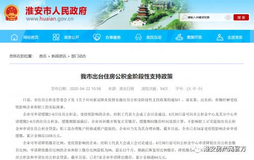 淮安房产网4月22日讯 据淮安市人民政府网站援引淮安日报消息称,淮安市住房公积金管委会下发《关于应对新冠肺炎疫情实施住房公积金阶段性支持政策的通知》,规定企业可缓缴2-6月住房公积金,并可申请降低缴存比例,同时对职工支付房租提取住房公积金额度给予提高。