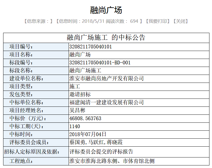 融尚广场由淮安荣尚房地产开发有限公司投资建设,计划总建筑面积14.12万平方米,目前主体已全部封顶,正在进行二次结构施工、商业部分内外装修等工程;