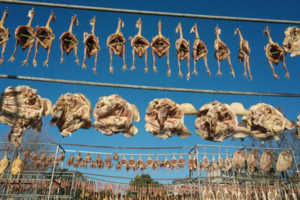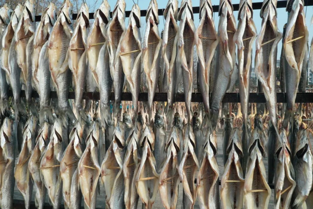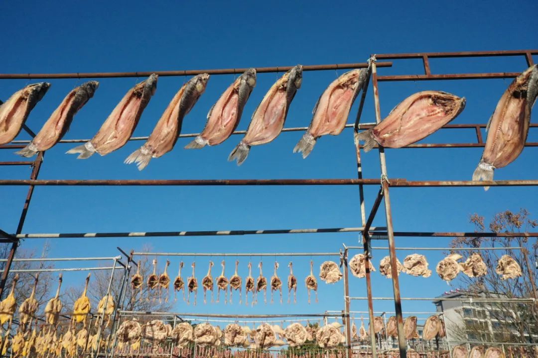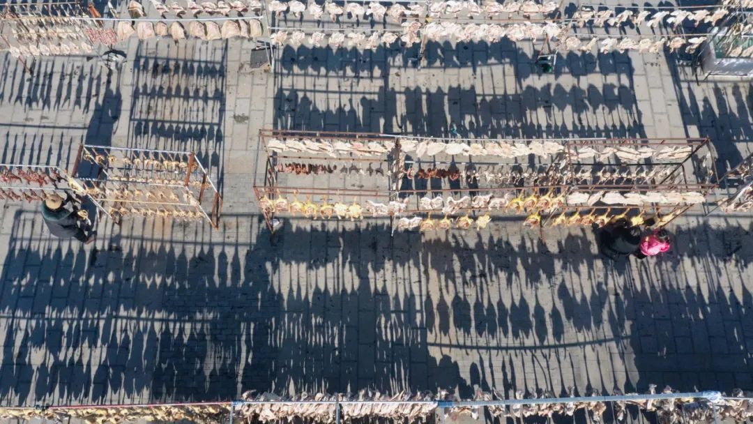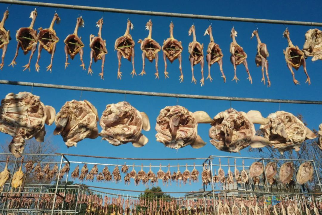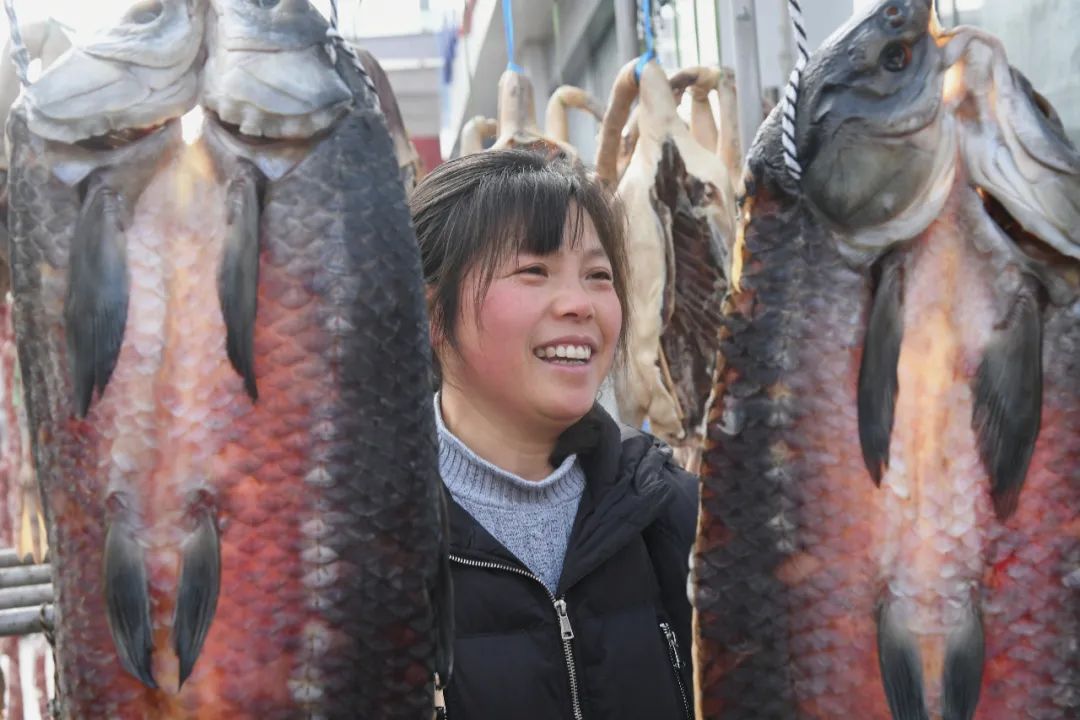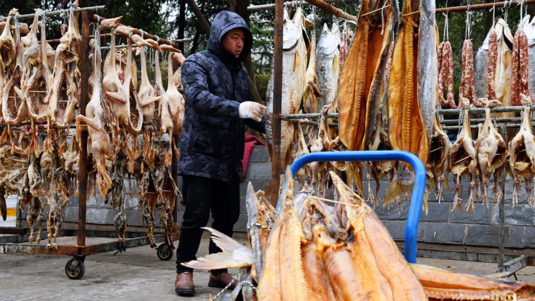 在洪泽区洪泽湖美食城,各大商家门口挂满了咸鱼、腊肉、香肠、风干鸡鸭鹅等美味,散发着诱人的香气与浓浓年味。高良涧街道一位董姓商户介绍说,中国人的年味里少不了咸鱼腊肉,寓意年年有余,来年富足。仅自己一家,每天腌制好的青鱼、老鹅等咸货能卖出300余公斤。