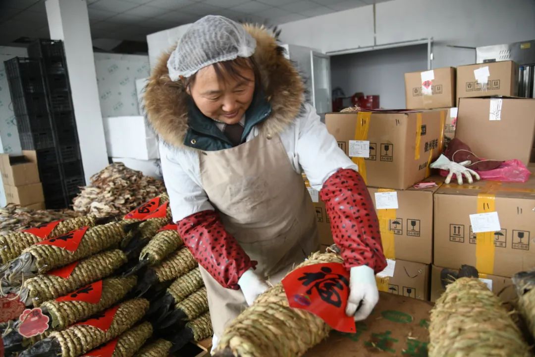 在洪泽区电子商务产业园,淮安渔姑娘食品科技开发有限公司工人们在车间内包装产品。公司负责人韩文静在包装上也更加注重细节,增加了红色“福”字等喜庆元素,使得产品卖相更加应景,让过年气氛更加浓郁。