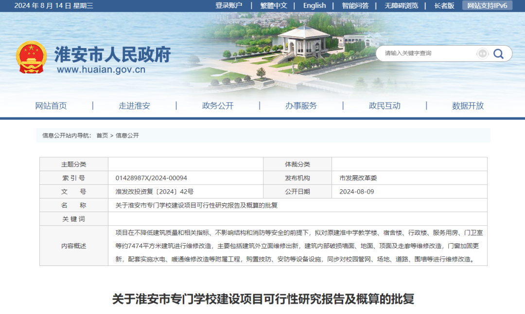 批复文件指出,为有效预防和减少未成年人犯罪,促进未成年人的健康成长和社会和谐发展,根据淮政发〔2024〕2号等文件,同意实施淮安市专门学校建设项目,项目主体(使用)单位为淮安市育人学校;根据市教育局《关于淮安市专门学校建设项目集中建设的情况说明》,项目集中建设实施单位为淮安市国有投资发展集团有限公司全资子公司淮安市国联建设管理有限公司。