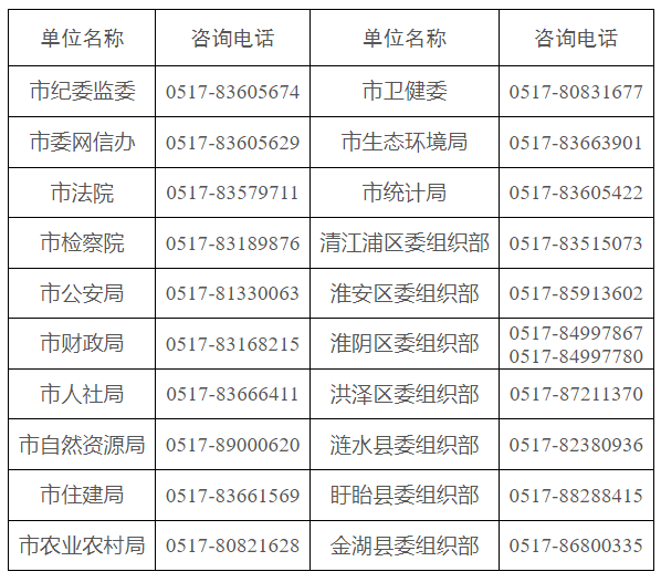 各招录机关的招考人数、具体职位、考试类别、资格条件等信息可通过以下网站查询:淮安党建网(zzb.huaian.gov.cn)“招录招聘”专栏、淮安市人力资源和社会保障局门户网站“人事考试”专栏(http://rsj.huaian.gov.cn/col/4729_463783/index.html)。
