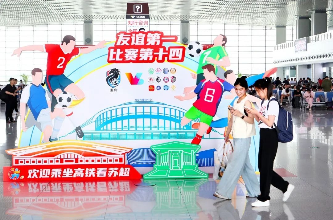 淮安东站在进站口、出站口、候车室、候车专区等位置,提前制作并摆放“苏超”淮安队和南京队队徽、吉祥物展板展架,营造友好氛围。比赛当天,淮安东站安排专人使用“苏超”比赛专用引导牌,引导专列上的南京球迷通过专用通道,有序便捷快速出站,缩短球迷出站时间。为保障观赛游客顺利返程,车站优化球迷进站通道,增开安检通道、增设安检人员,在候车室划定专列专用候车区,组织专人引导球迷旅客进站乘车,方便球迷快速进站乘车。