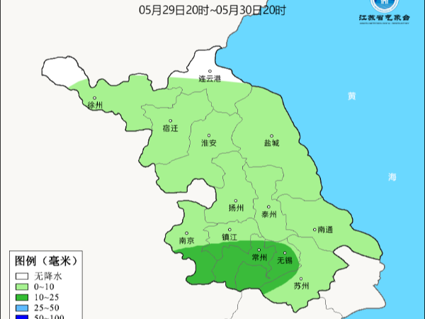 从全省范围看30日淮河以南地区有一次降水过程其中沿江和苏南地区雨量中等未来两天天气预报如下5月30日20时到5月31日20时沿江和苏南地区阴有阵雨或雷雨并渐止转阴到多云,其中苏南南部地区雨量中等,其他