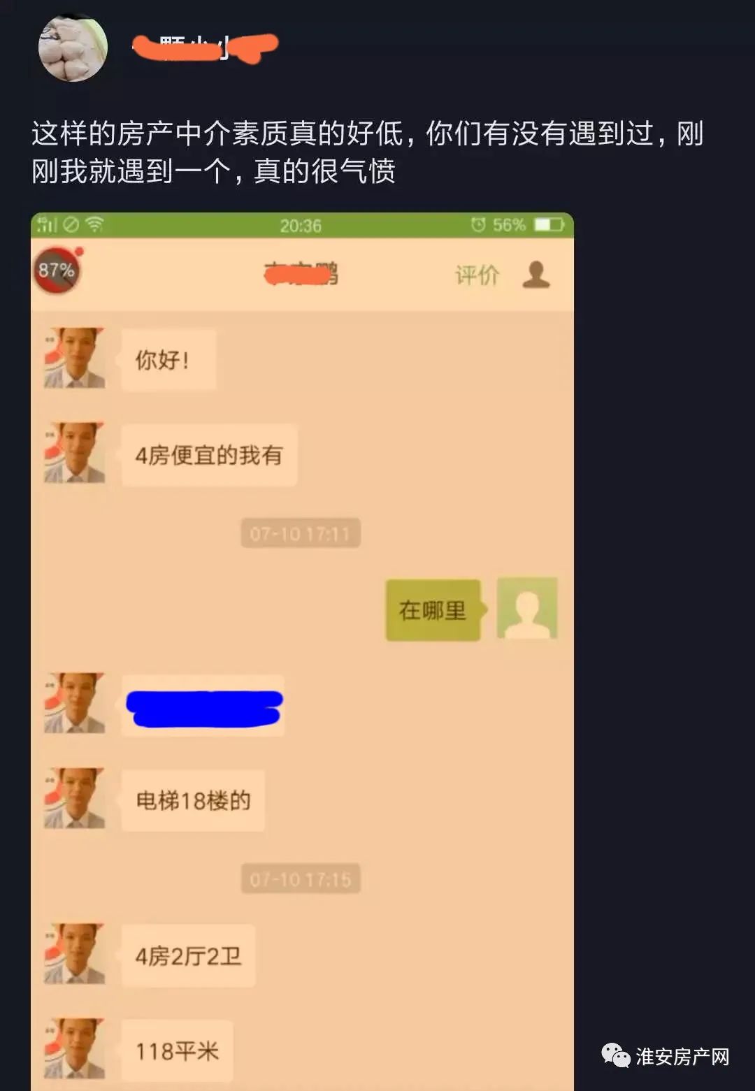 内容是这样的:“这样的房产中介素质真的好低,你们有没有遇到过,刚刚我就遇到一个,真的很气愤。”