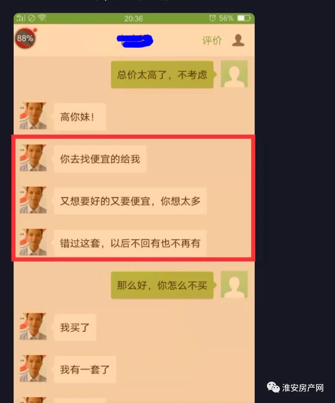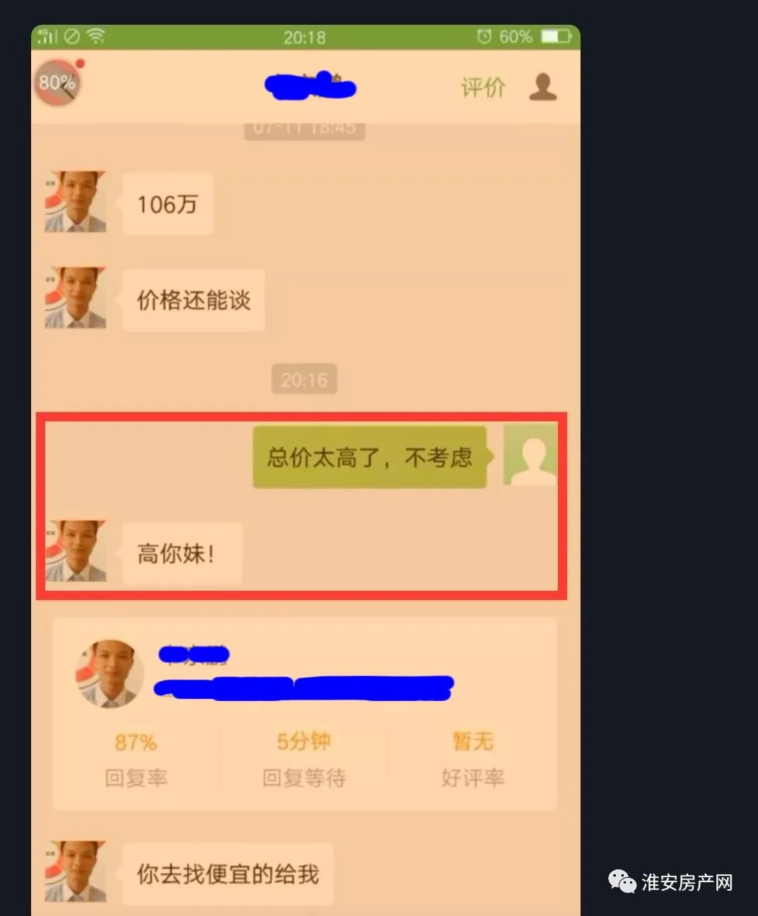 先来看看这个价格,房子面积118平米,总价106万,后面的对话中还透露了坐标淮安。
