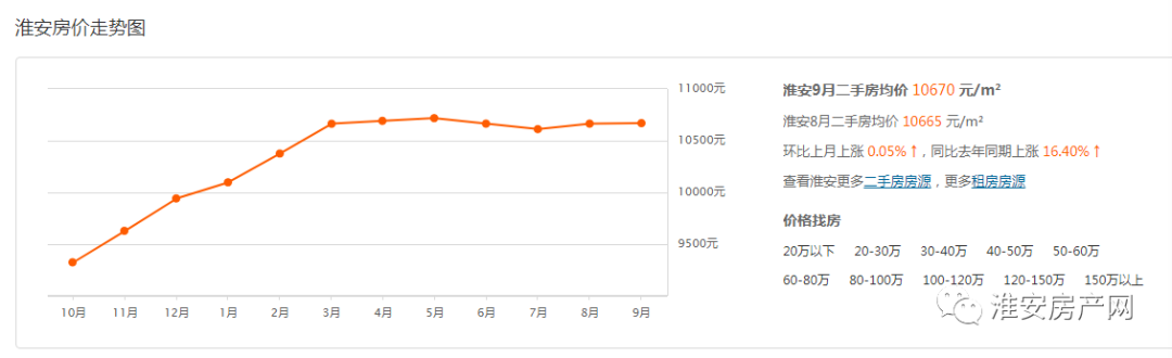 疫情后,房价尤其是二手房涨幅的波动较大,从安居客上得数据来看,淮安9月开头房均价10670元/m²,8月二手房均价10665元/m²,环比上月上涨了0.05%,同比去年同期上涨16.40%,总体上与上个月较为接近。