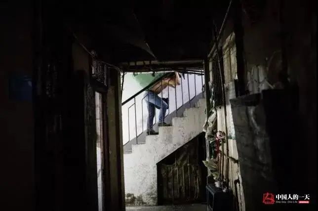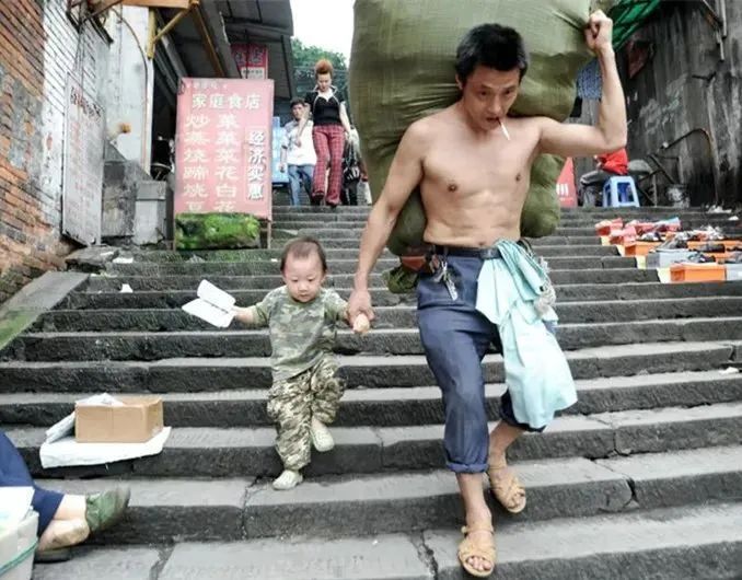 照片中,重庆“棒棒”冉光辉扛着一百多斤的货物,牵着3岁儿子,走下重庆朝天门批发市场旁的梯坎。