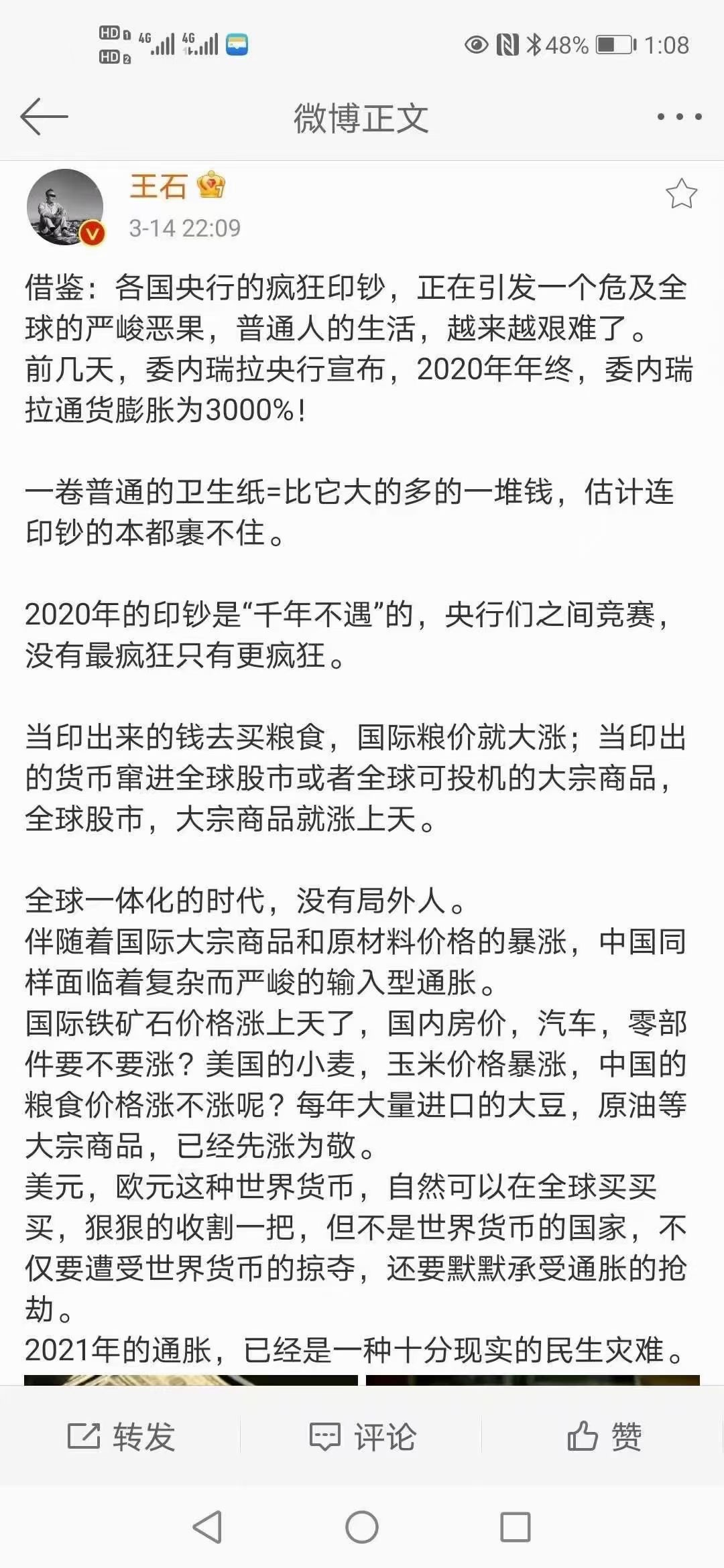 万科集团创始人王石曾在微博上发表文章:各国央行疯狂印钞,正在引发一个危及全球的严峻恶果,普通人的生活越来越艰难了!