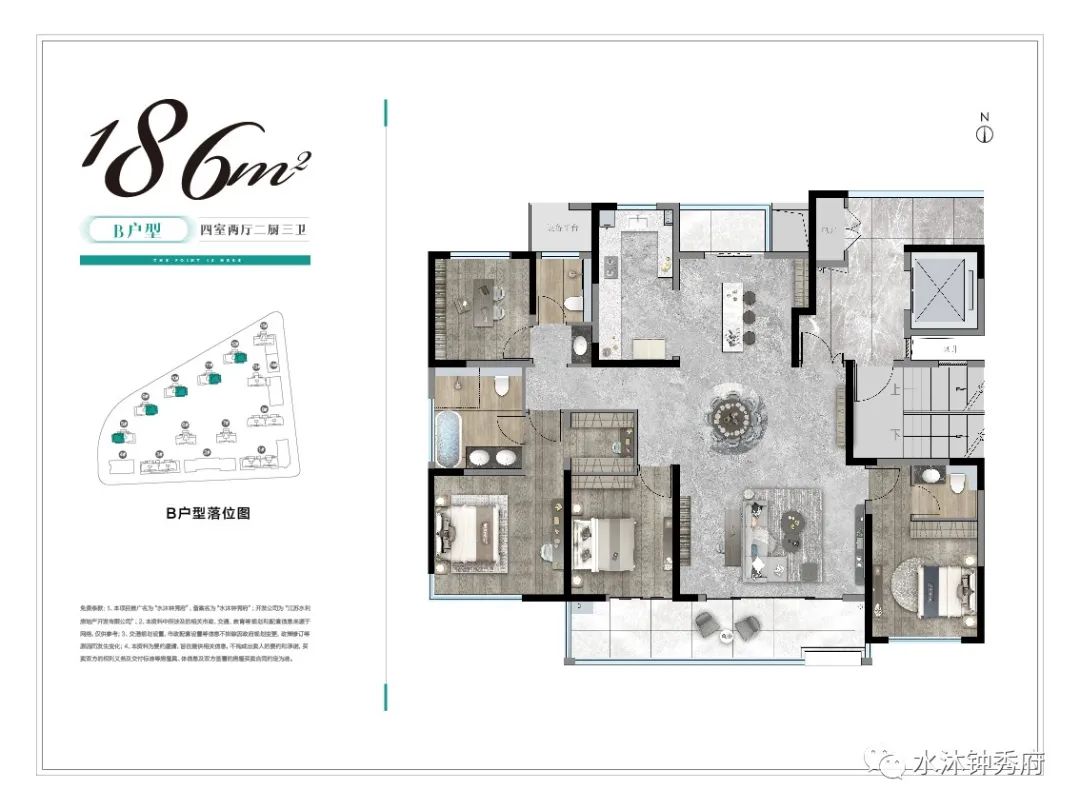 项目由淮安本土国企水利打造,规划11栋住宅,共计643套房源,层高15-26F,户型建面约138-186㎡。