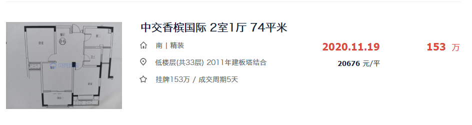 对比2020年11月份,小区当时有一套房源直接冲上了峰顶——一套74㎡的2室1厅房源,以153万的总价成交,单价高达20676元/㎡!这也是该小区在贝壳上目前已知的最高单价。