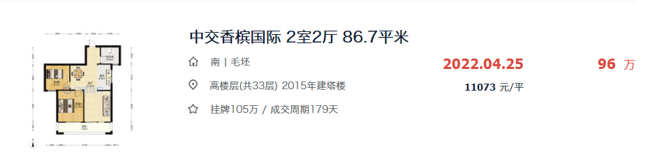 今年4月份,中交香滨国际成交了一套面积约87㎡的高层小户型,成交总价96万元,成交单价11073元/㎡。