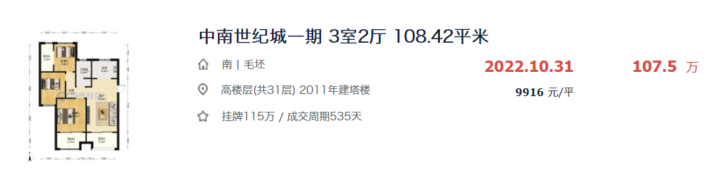 中南世纪城一期,最新的挂牌均价11925元/㎡,小区在今年10月31日成交了一套108.42㎡的三室房源,成交总价107.5万,折合单价约9916元/㎡。