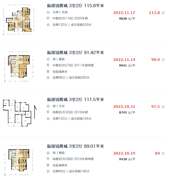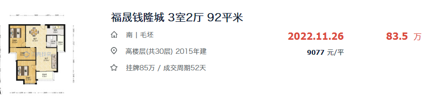 福晟钱隆城,一套3室2厅面积92㎡的毛坯高层,成交总价83.5万元,成交单价为9077元/㎡。