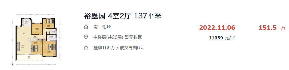 裕墨园高层成交价约11000元/㎡,洋房约13000-14000元/㎡;