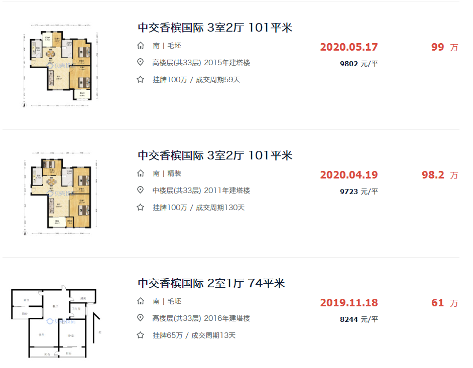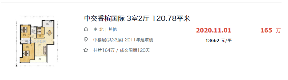 当然了,这套单价8288元/㎡成交的房源肯定是小区的个别现象,因为从今年的成交记录来看,中交香滨国际正常的成交价在10000元/㎡左右。