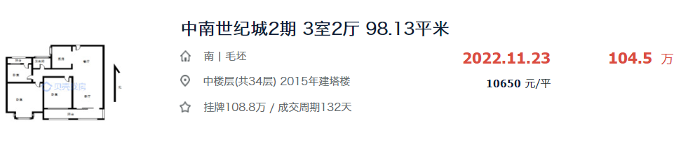 中南世纪城二期,最新的挂牌均价12426元/㎡,今年11月23日成交了一套98.13㎡的三室房源,成交总价104.5万,折合单价约10650元/㎡。