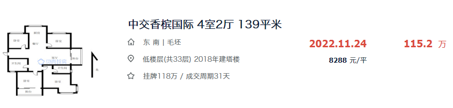 生态新城的中交香滨国际小区,最新成交了一套139㎡的4室2厅毛坯高层,成交总价115.2万,折合成交单价只有8288元/㎡!