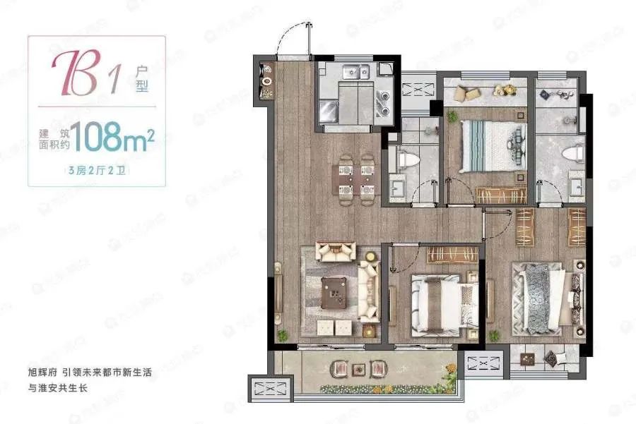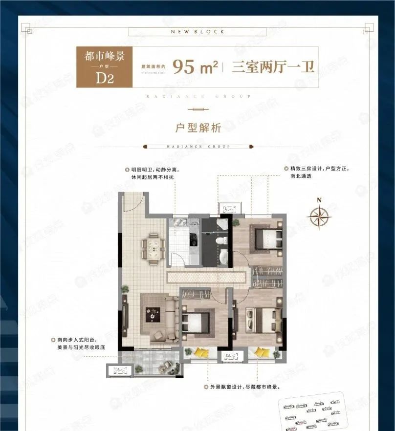 再如金辉优步东郡的主力户型,建面约95㎡,三房两厅一卫,成品交付,房源户型方正,南北通透,屋内的飘窗设计增加了使用面积,刚需客友好。