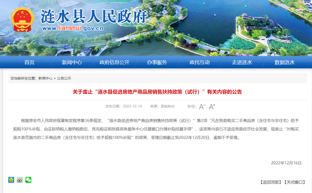 根据淮安市人民政府规章制定程序第36条规定,“涟水县促进房地产商品房销售扶持政策(试行)”第2项“凡在我县购买二手商品房(含住宅与非住宅)给予契税100%补贴,由实际纳税人缴纳税款后,凭完税证明到县政务服务中心住建窗口办理补贴结算手续”,该政策内容已不适应我县经济社会发展,现废止“对购买涟水县范围内的二手商品房(含住宅与非住宅)给予契税100%补贴”的政策,受理日期截止到2022年12月20日,逾期不予受理。
