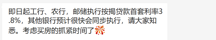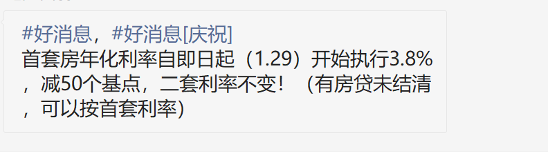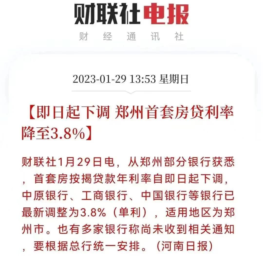 随着首套住房贷款利率政策动态调整机制建立,春节后房贷利率下调的城市陆续增加,地产需求端的支持政策正加速落地。1月29日,省会城市郑州部分银行宣布首套房贷利率下调,最低降至3.8%,二套利率不变,即日起执行。据了解,1月29日,郑州部分银行已确认首套房按揭贷款年利率自即日起下调,中原银行、工商银行、中国银行等银行已最新调整为3.8%(单利),适用地区为郑州市。也有多家银行称尚未收到相关通知,要根据总行统一安排。郑州华润、信达、正弘等多家房企在售楼盘置业顾问表示,29日上午已接到通知,自即日起(1月29日),郑州首套房年化利率开始执行3.8%的标准,二套房保持4.9%的利率不变。外地房贷未结清,在郑州购房可按照首套首付及利率政策执行。这得益于央行、银保监会1月5日发布的政策,去年9-11月新房、二手房价同比、环比均下降的城市可自主下调利率。据统计,全国符合该条件的城市有39个,包括郑州、天津、大连、福州、厦门、武汉、无锡、徐州等大中城市,它意味着全国更多城市可能会下调房贷利率。虽然大概率是阶段性的调整,但也确实能利好在这个期间买房的群体。江苏发布多项举措,全力推动经济运行率先整体好转,淮安跟进!近日,江苏省人民政府印发关于推动经济运行率先整体好转若干政策措施的通知(苏政规〔2023〕1号)。文件共发布42条措施,涉及财税、实体经济、就业、企业减负、消费、投资、外贸、房地产、医疗保障等十二大方面,着力稳增长、稳就业、稳物价,改善社会心理预期、提振发展信心,全力推动经济运行率先整体好转。1、因城施策用足用好房地产调控政策工具箱,调整优化限制性政策和土地出让政策,大力支持刚性和改善性购房需求,坚持“房住不炒”,认真落实居民个人换购住房个人所得税政策。根据实际情况调整公积金贷款政策,完善征收拆迁安置补偿方式,优化商品房价格备案制度。2、支持房地产业合理融资需求,加大建筑业金融支持力度,重点推进支持开发贷款、信托贷款等存量融资合理展期政策落地见效。用足用好国家专项借款,鼓励商业银行加大配套贷款力度,全力以赴保交楼,切实维护购房者利益。支持符合条件的房地产企业、房地产上市公司利用资本市场支持房地产市场发展的股权融资政策,开展再融资、并购重组及配套融资。支持省内融资担保公司加入交易所债券市场民营企业债券融资专项支持计划,央地合作增信共同支持民营房地产企业发行公司债券。3、指导并督促各地根据国家要求,优化调整商品房预售资金监管政策,在保障商品房预售资金使用安全和项目正常交付的前提下,合理释放监管额度内的资金,促进房地产企业加快资金回笼。1月29日,淮安市人民政府印发《市政府办公室关于贯彻落实省政府推动经济运行率先整体好转若干政策措施的实施意见》淮政办发〔2023〕2号,全力推动经济运行率先整体好转,实现质的有效提升和量的合理增长。促进房地产市场平稳健康发展。优化二手房“带押过户”服务,有序开展商转公贷款业务,优化提取公积金偿还商贷方式,适当延长阶段性支持政策。坚持“房住不炒”,指导辖内金融机构保持房地产开发贷款、个人住房贷款等稳定增长。开展“好房名企”线上线下推广宣传活动。出台《淮安市区商品房预售资金监管实施细则》,提升商品房预售资金监管效能。从房地产调控因城施策,大力支持刚性和改善性购房需求,坚持“房住不炒”到支持房地产业合理融资需求等,不难发现房地产的重要地位依旧没有变!随着后期其他城市不断跟进,各城市各方面政策不断放开,利率从4字头进入到3字头阶段,买房人意愿提升,市场也将会得到提振。无论是首次置业的刚需,还是需要换房、升级资产的改善,当下都是优质的买房窗口期