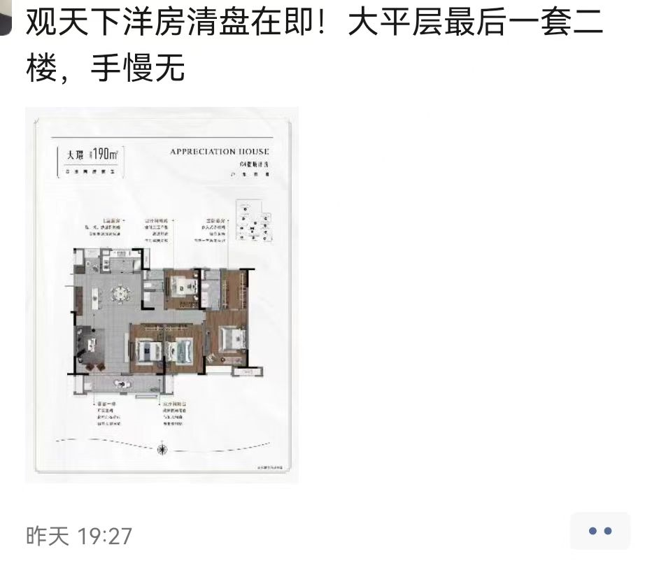 值得一提的是,除了整个项目进入尾盘状态外,最近观天下有置业顾问曾发布朋友圈称,洋房即将清盘。