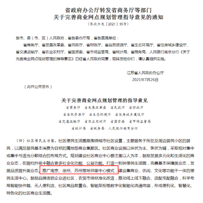 早在2021年,江苏省政府在《关于完善商业网点规划管理指导意见》中曾提到:推广邻里中心模式,建设集商业、休闲、文化等功能于一体的便民生活中心。