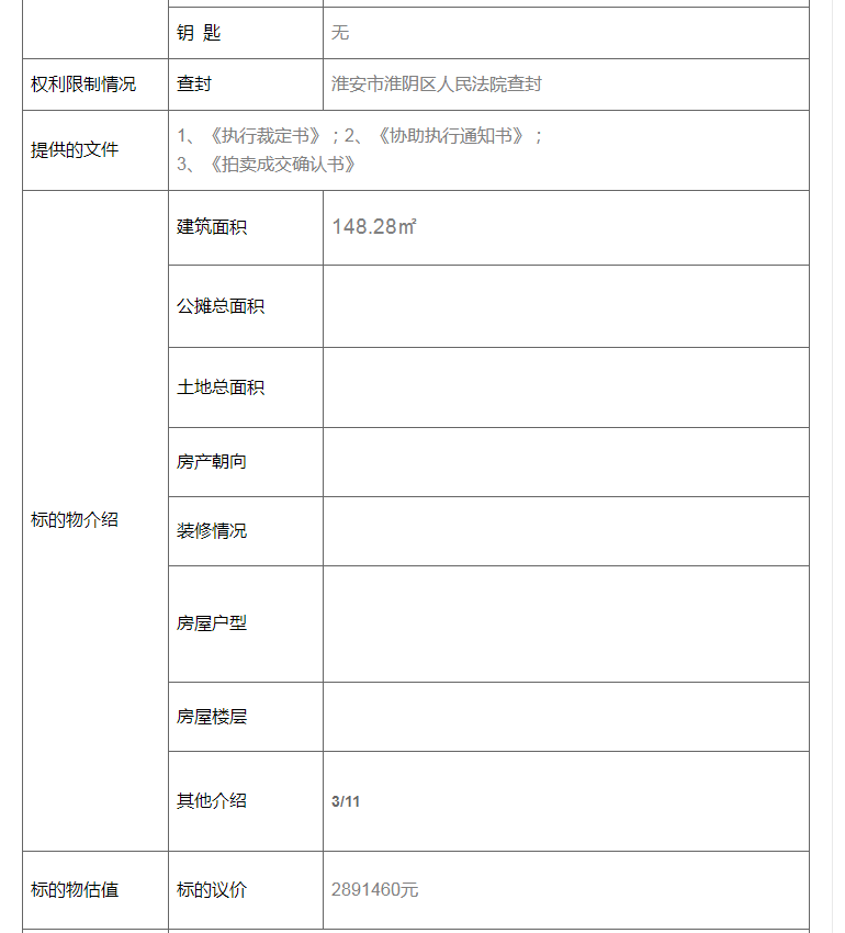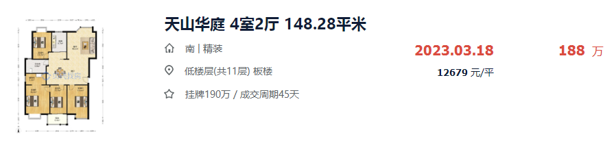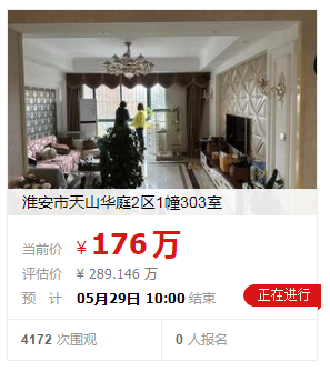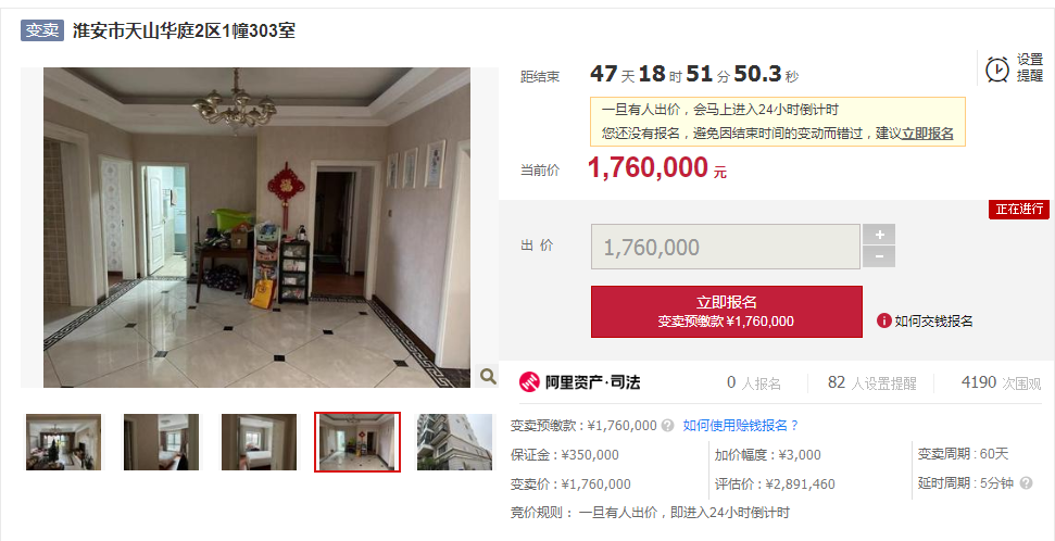 刚刚,小编在阿里拍卖看到,清江浦区天山华庭的一套法拍房,总价降价约113万拍卖,吸引了超4000人围观。超4000人围观!天山华庭一房源降价113万,却无人问津……这套房源位于淮安市天山华庭2区1幢303室,总层数为11层,建筑面积为148.28㎡,该套房源的起拍价格为176万,折算单价约为1.19万/㎡,市场评估价为289.146万,相比于市场价格,下降约113万。值得注意的是,该套房源已经进入了变卖程序,一旦有人出价就会马上进入24小时倒计时。一般来说,对于不动产,连续两次降价,在网络拍卖都流拍的,该物品在第二次流拍之后进入司法变卖程序。那么,为什么总价低于市场价113万,这套房源依然两次流拍,无人问津?天山华庭位于清江浦区淮阴师范学院第一附属小学施教区范围内,学区配套比较优质。目前,天山华庭的挂牌价为17394元/㎡,有73套房源正在出售,近90天有2套房源成交。小编在贝壳找房网站查看小区近期成交房源,发现天山华庭上个月成交了一套面积一样的户型,成交总价188万,均价约1.27万/㎡。而这套法拍房源均价1.19万/㎡、总价176万,对比下来,性价比并没有很高。但是,天山华庭的小户型,二手房价格近2万/㎡。天山华庭位于清江浦老城区,靠近淮阴区,周边配套比较完善,小区附近有淮安市第一人民医院、南北方分界标志园、淮安博物馆、淮海商圈等丰富配套。