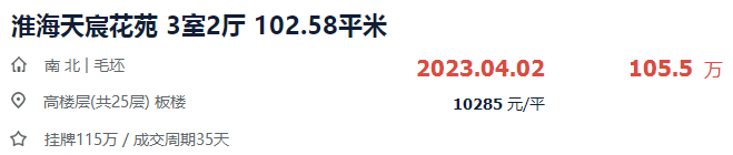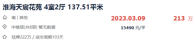 随着去年一批改善新房的交付,淮安主城可售的次新房队伍愈发壮大。这些次新房交付以后,有些二手房价上涨,也有次新房几乎没涨,甚至亏本卖出……今天,小编盘点了部分已交付楼盘的房价,淮安主城次新房成交到底涨了多少?跌了多少?打算买次新房的业主可以作为参考。二手房挂牌:挂牌量215套,小区均价11152元/㎡,近90天成交12套房;据贝壳找房数据,目前融创广场已成交22套二手房,其中:单价最高的1套为141.39㎡四房,成交总价166万,单价11741元/㎡。单价最低的1套为106㎡三房,成交总价98万,单价9246元/㎡。涨幅:最高成交单价为1.17万/㎡,按新房8990元/㎡计算,融创广场交付不到半年,最高涨幅达到30.6%。二手房挂牌:挂牌量178套,小区均价12765元/㎡,近90天成交5套房;据贝壳找房数据,目前淮海天宸花苑已成交8套二手房,其中:单价最高的1套为137.51㎡洋房,成交总价213万,单价15490元/㎡。单价最低的1套为102.58㎡三房,成交总价105.5万,单价10285元/㎡。涨幅:最高成交单价为1.55万/㎡,按新房1.15万/㎡计算,淮海天宸花苑交付不到半年,最高涨幅达到34.8%。降幅:最低成交单价为1.03万/㎡,按新房1.15万/㎡计算,淮海天宸花苑交付不到半年,最高降幅达到10.4%。开盘均价:毛坯高层8600元/㎡、精装高层9600元/㎡、多层洋房11800元/㎡