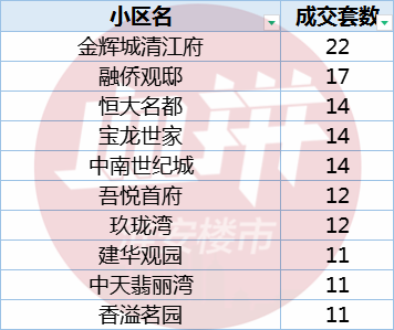 第一,金辉城清江府依旧独占鳌头,本月共成交22套。