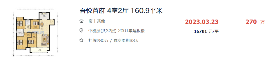 生态新城的吾悦首府成交价也在降,最新的一套房源成交单价16781元/㎡,想当年都是单价超2万+的房源,如今要想成交只能让步。