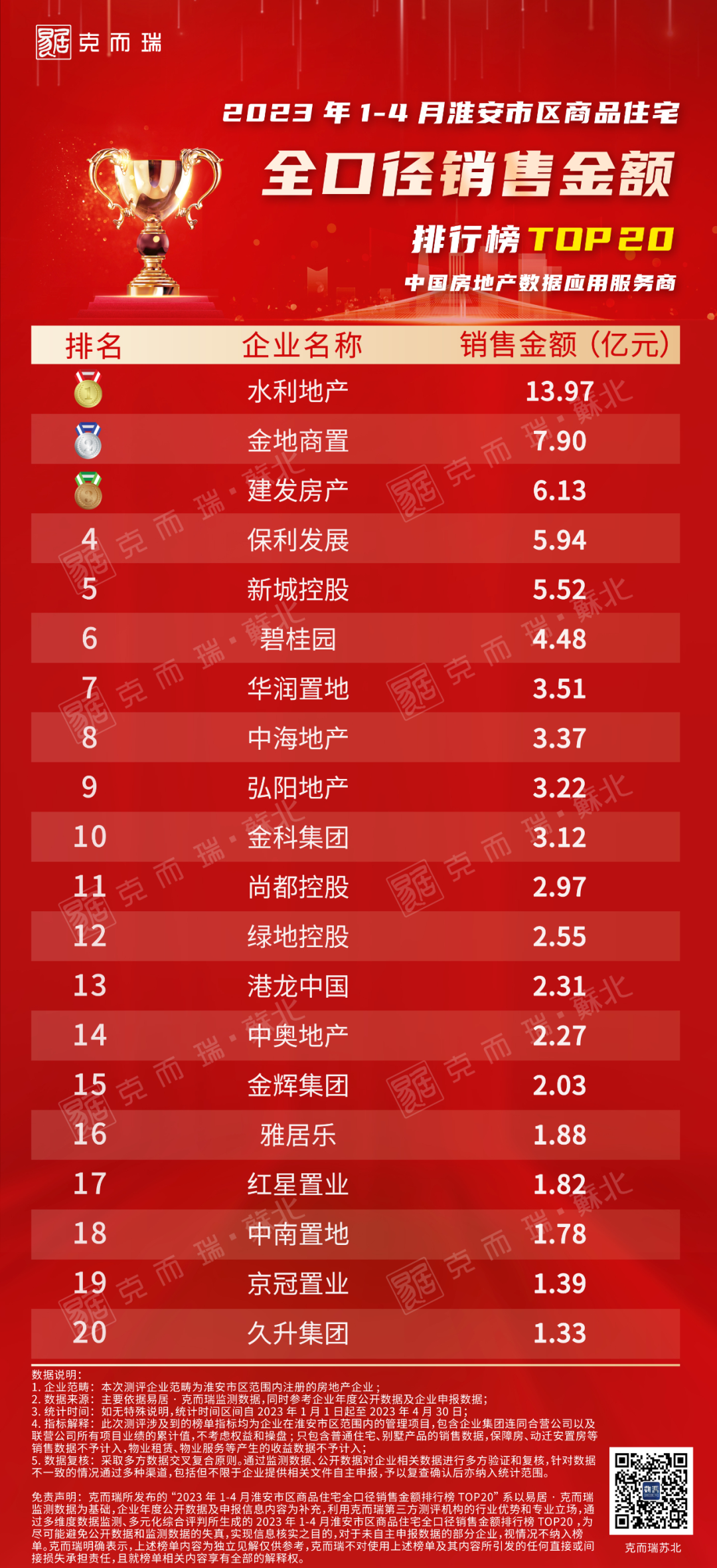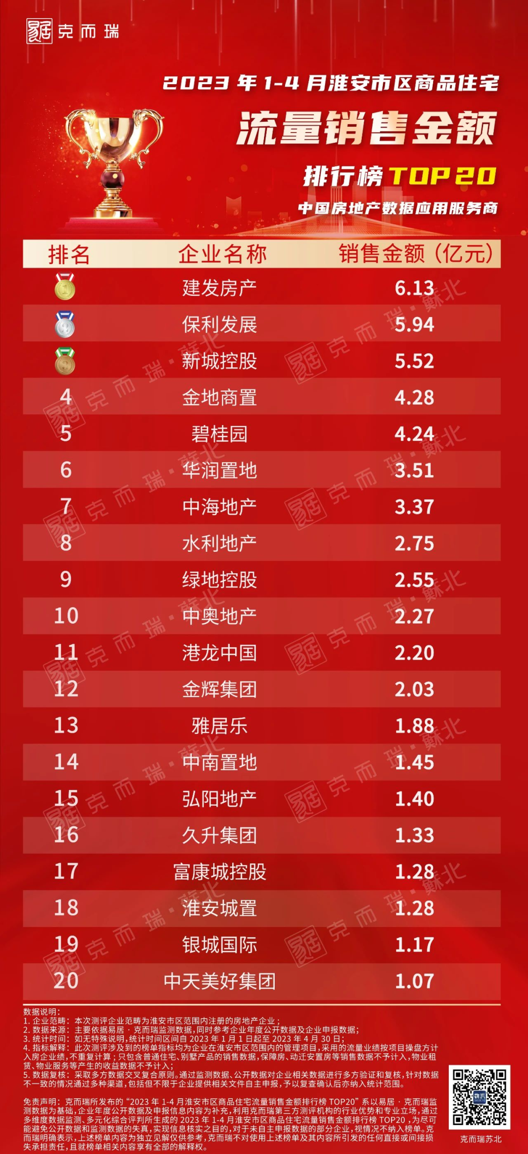 本次克而瑞苏北发布的2023年1-4月淮安房企销售排行榜,用数据来呈现房企的业绩表现: