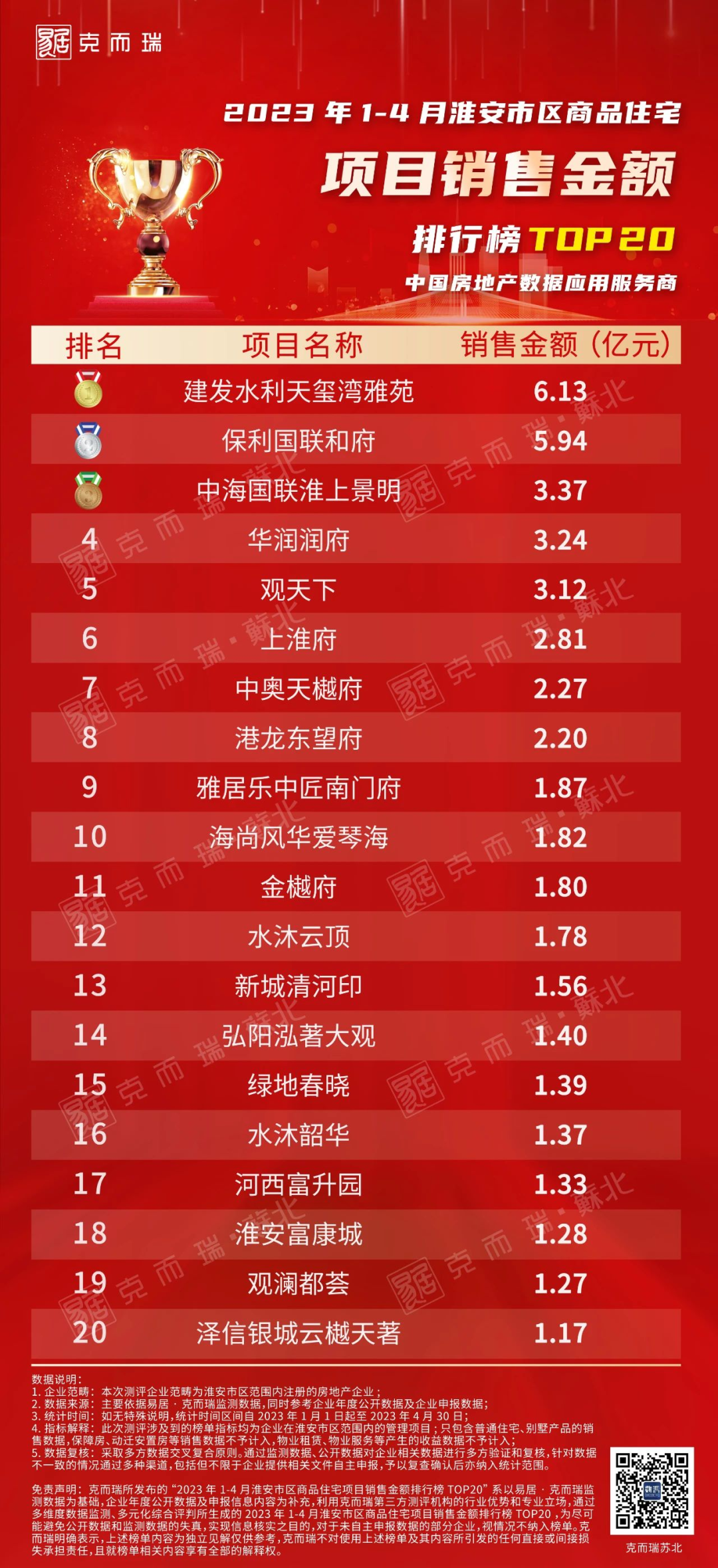 建发水利天玺湾雅苑(约6.13亿元),保利国联和府(约5.94亿元),中海国联淮上景明(约3.37亿元)摘得项目销售金额榜前三名。