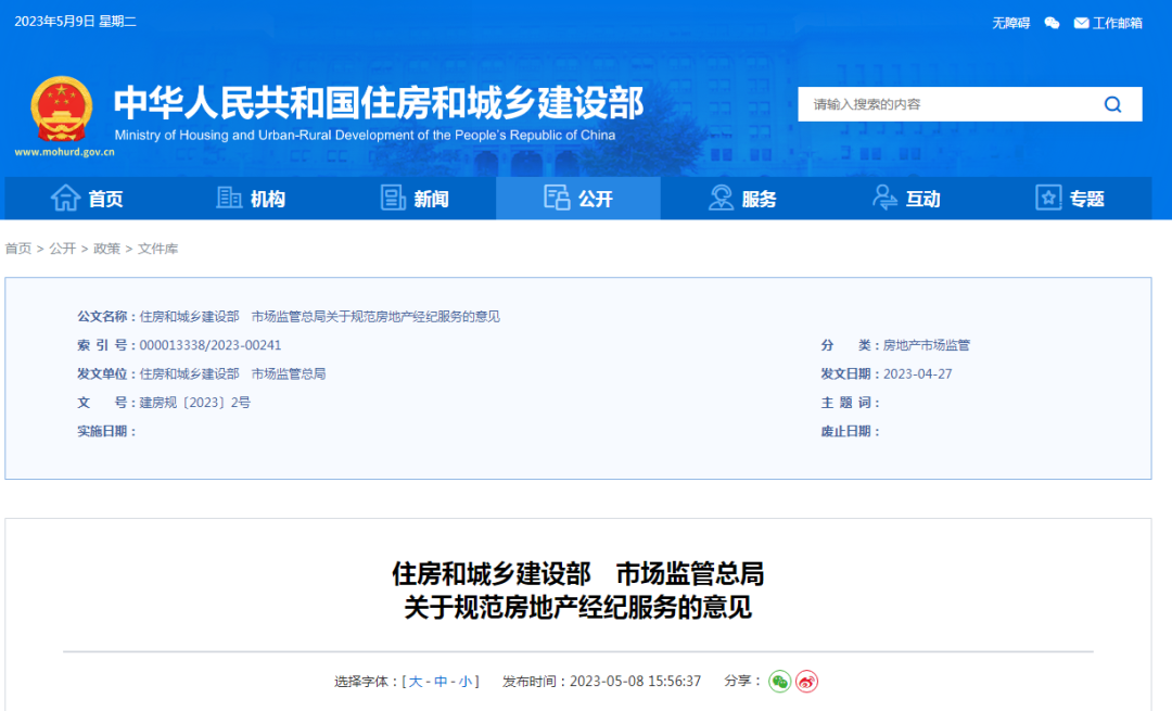 为规范房地产经纪服务,加强房地产经纪行业管理,促进房地产市场健康发展,5月8日,住房和城乡建设部、市场监管总局联合印发《关于规范房地产经纪服务的意见》(以下简称《意见》)。《意见》坚持问题导向,突出保护交易当事人合法权益,明确了二手房中介费、明码标价、操纵经纪服务收费等10个方面的监管措施。