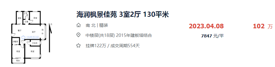 最近成交的一套房源,是130㎡的精装房源,成交单价7847元/㎡,成交总价102万元。