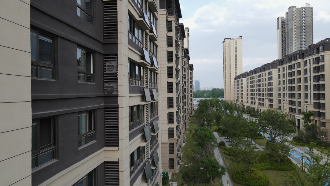 对于绿化园林,从现场航拍图来看,时值初夏,项目中央景观带除了树木跟灌木绿地盎然,草坪的长势就没那么好了,并且这个现象并非一处。