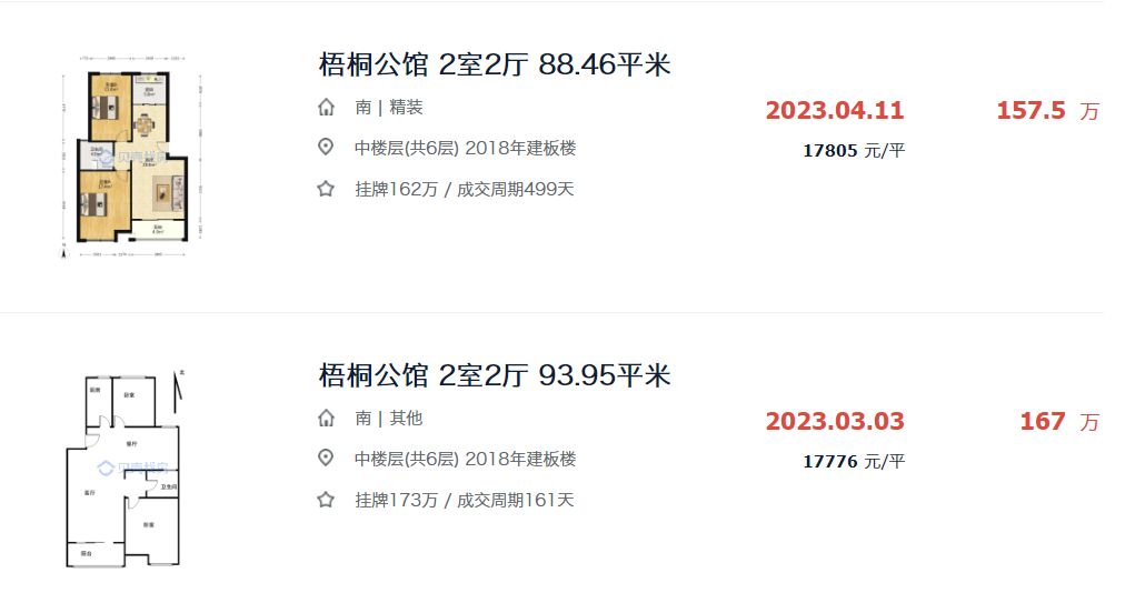 在今年3、4月份,梧桐公馆相同面积段的小户型成交价还要约1.7万/㎡,降了约3000元/㎡!
