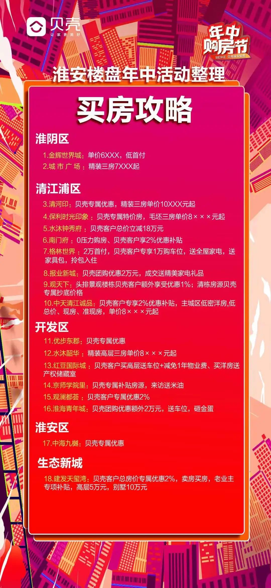 正巧在这两天,贝壳渠道整理一份年中买房活动攻略,在这一份攻略中,我们看到了很多楼盘都有不同程度的优惠方式。