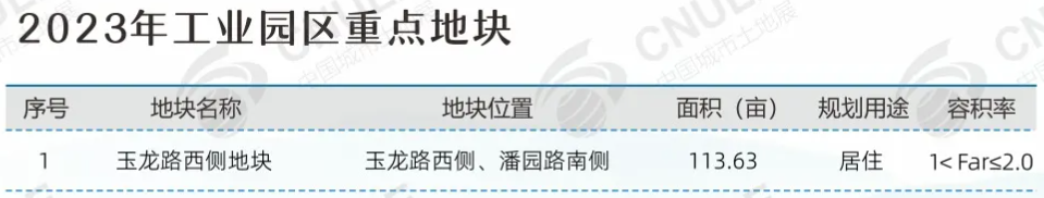今年工业园区有1宗土地推介,占地面积113.63亩,居住用地,容积率1< Far<2.0。