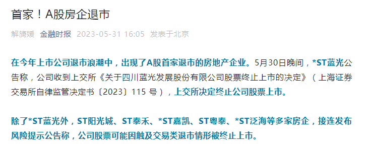 先是首家A股房企*ST蓝光退市,随后又有ST泰禾、*ST阳光城等多家房企发布风险提示公告称,公司股票可能因触及交易类退市情形被终止上市。