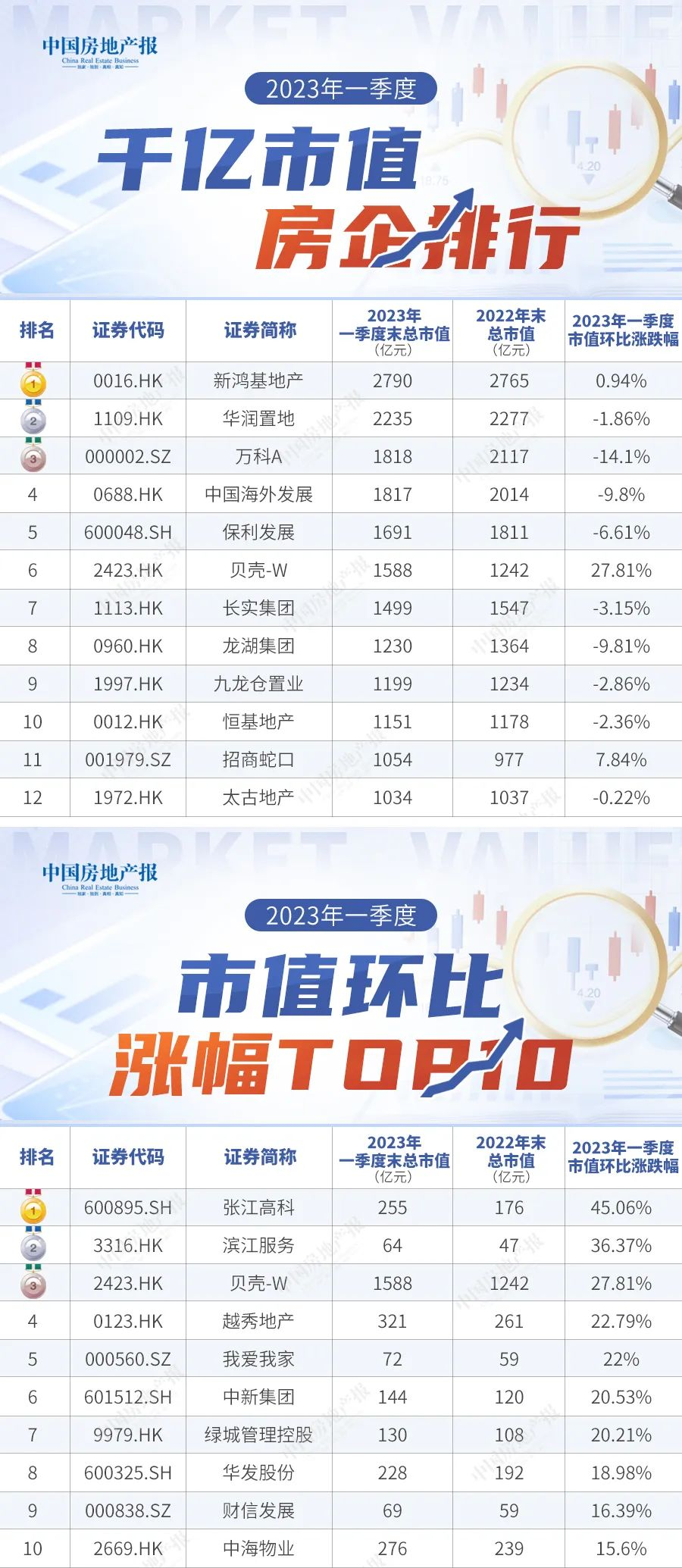 以下是千亿市值的房企排行,以及市值环比涨幅TOP10榜单。