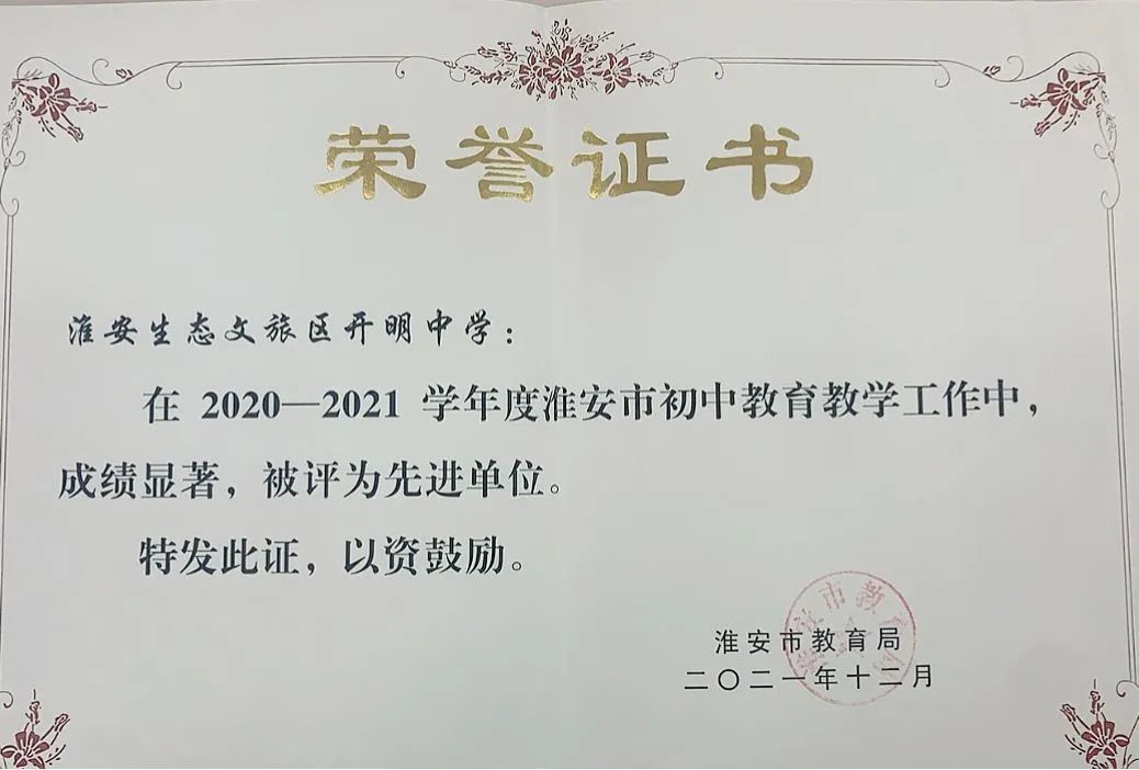 今年3月,该校再度被评为2021-2022学年度初中教育教学先进单位。