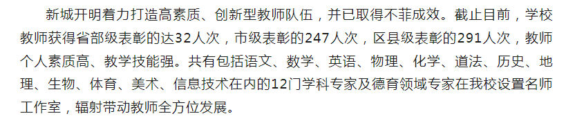 2022年5月的一则推文显示,截止当时新城开明中学教师共获得省部级表彰的达32人次,市级表彰的247人次,区县级表彰的291人次。