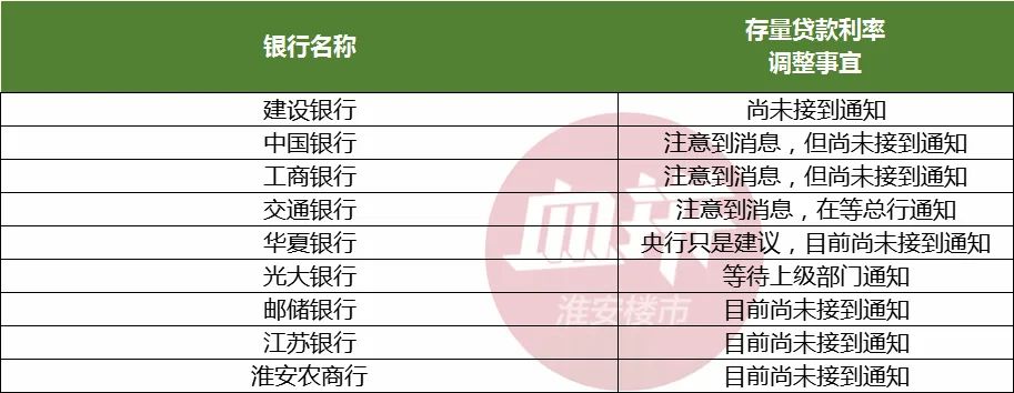 淮安主流的几家商业银行对于存量贷款利率下调的回应较为一致,目前都没有接到通知。