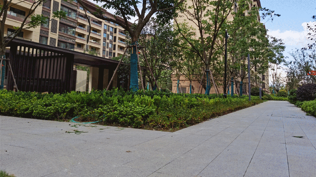 郁郁葱葱的树木延续了淮安叶语系小区一贯了高绿化率的特点。不同是,作为新中式的小区,园区从大门到门口的造景都有着浓浓的新中式风格。