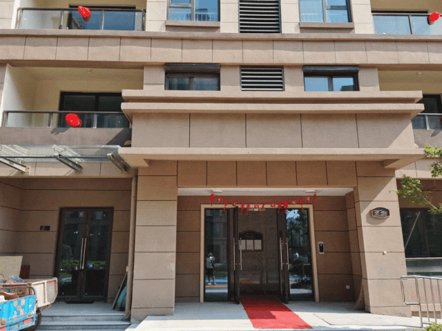 因为正值“交卷time”,我们可以看到,是单元入户、楼栋表面以及房子的入户,都被一抹红色点缀的,很有仪式感。地面上也被铺设了红毯。