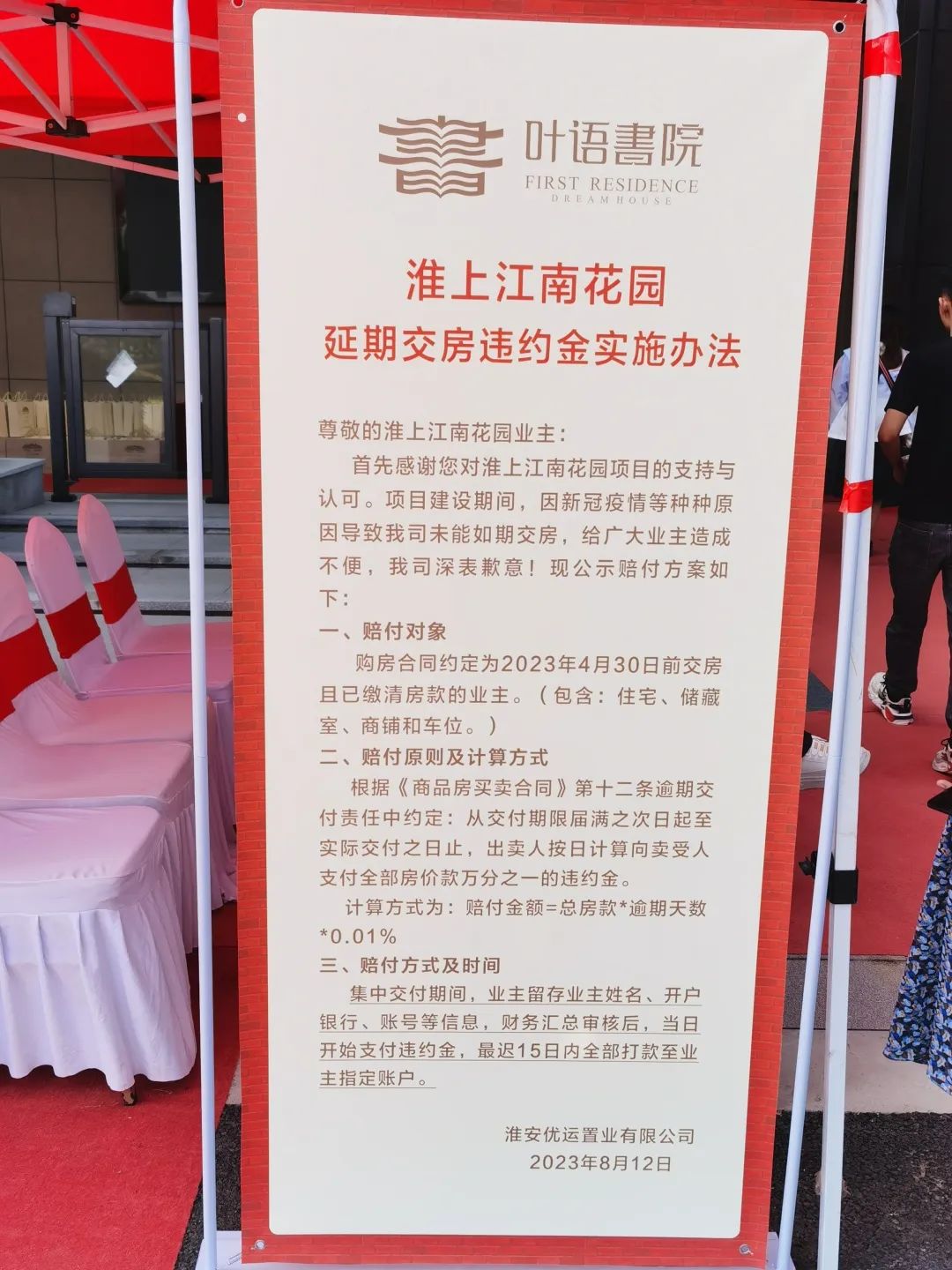 笔者在交付现场看到,在一则现场公示的“淮上江南花园延期交房违约金实施办法”中,房企明确:只要购房合同约定为2023年4月30日前交房且已缴清房款的业主均可按合同约定获得违约赔偿。