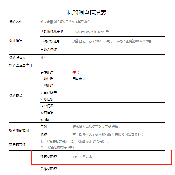 据阿里司法拍卖网站信息,融创广场的这套房源建筑面积为141.39㎡,起拍总价945667.2元,照此计算该房源单价仅6688元/㎡。