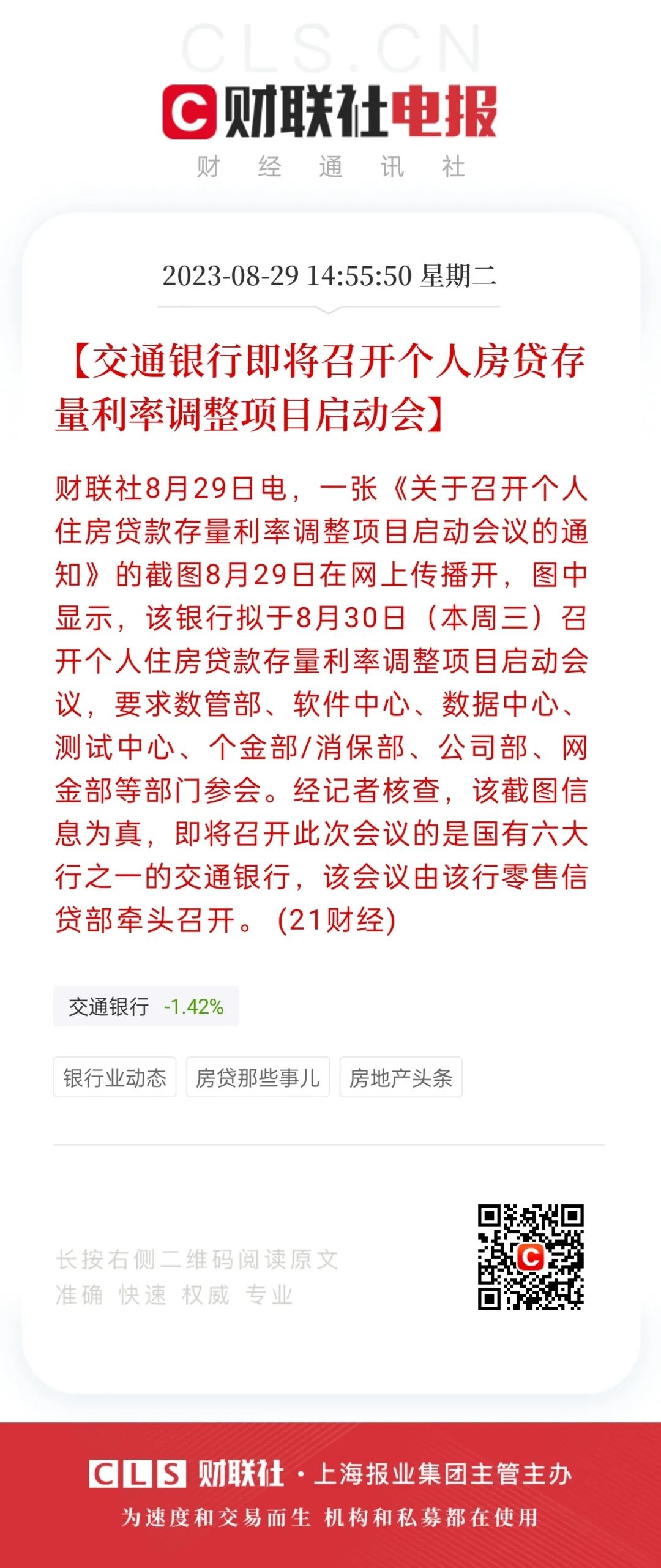 比如说,交通银行就曾传出8月30日召开个人住房贷款存量利率调整项目启动会。