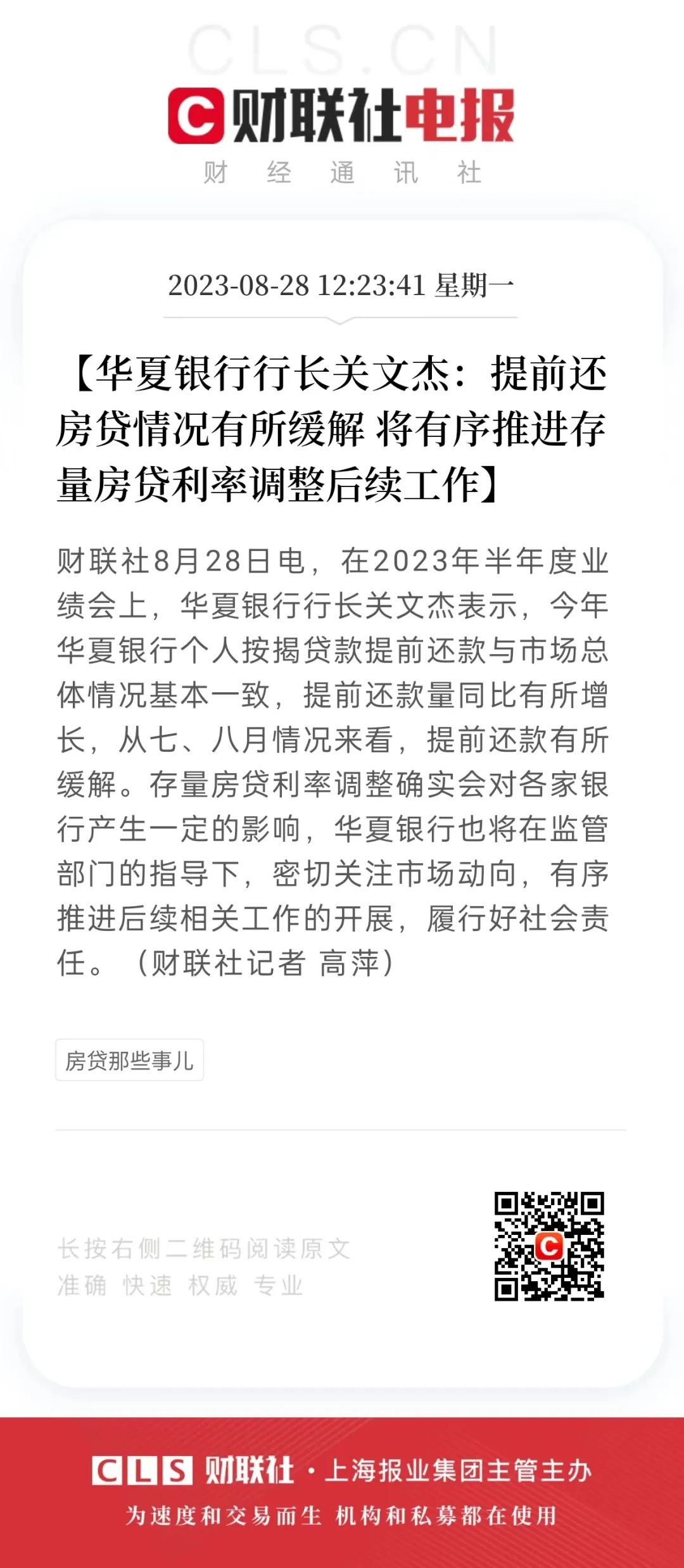华夏银行行长关文杰表示,今年华夏银行个人按揭贷款提前还款与市场总体情况基本一致,提前还款量同比有所增长,从七、八月情况来看,提前还款有所缓解。